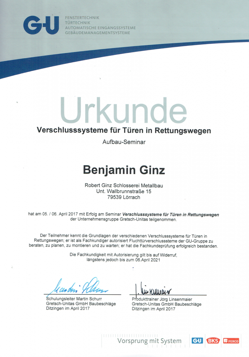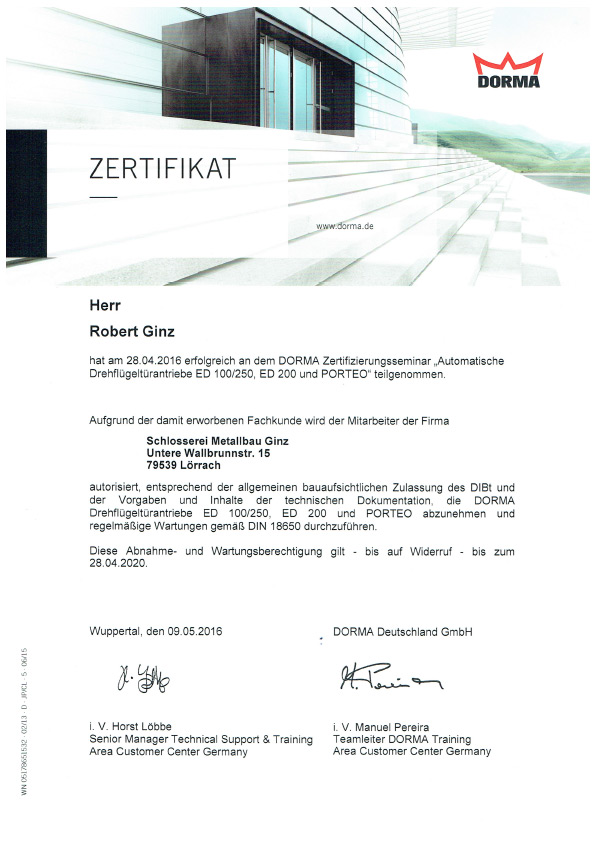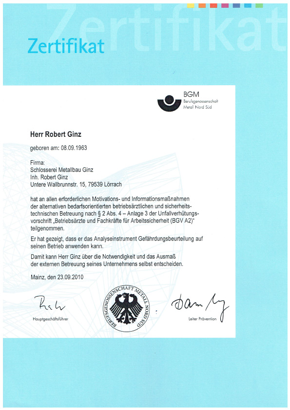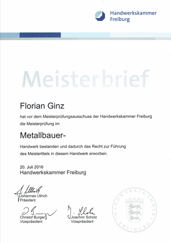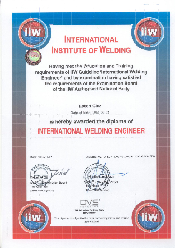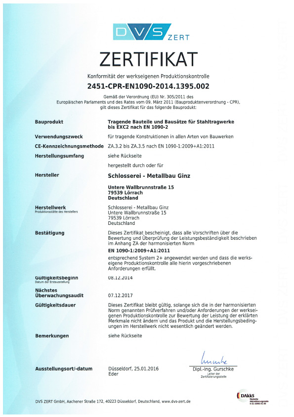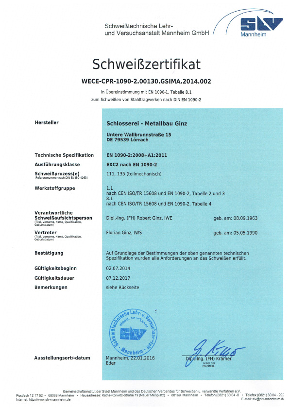 Unser Betrieb ist zertifiziert nach DIN EN 1090-1, DIN EN 1090-2 und DIN EN 1090-3 (EXC 2). Verantwortliche Schweißaufsichtsperson: Robert Ginz, Internationaler Schweißfachingenieur SFI/IWE.